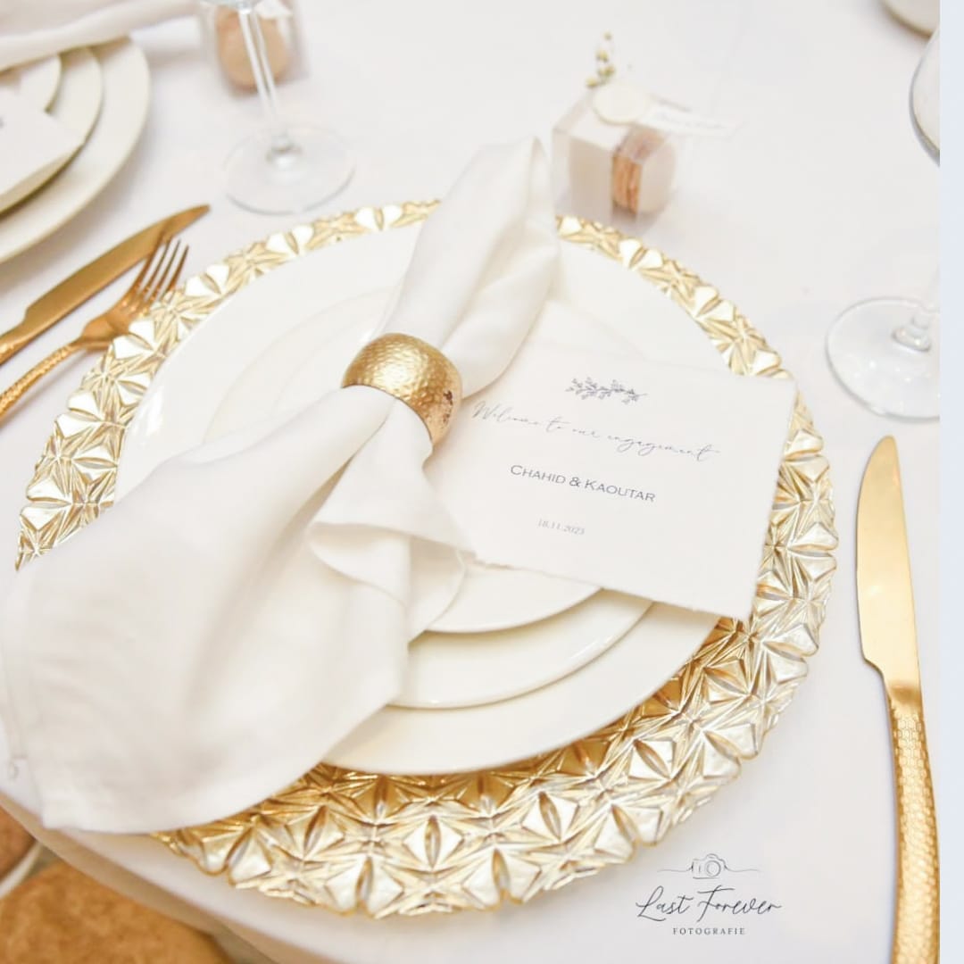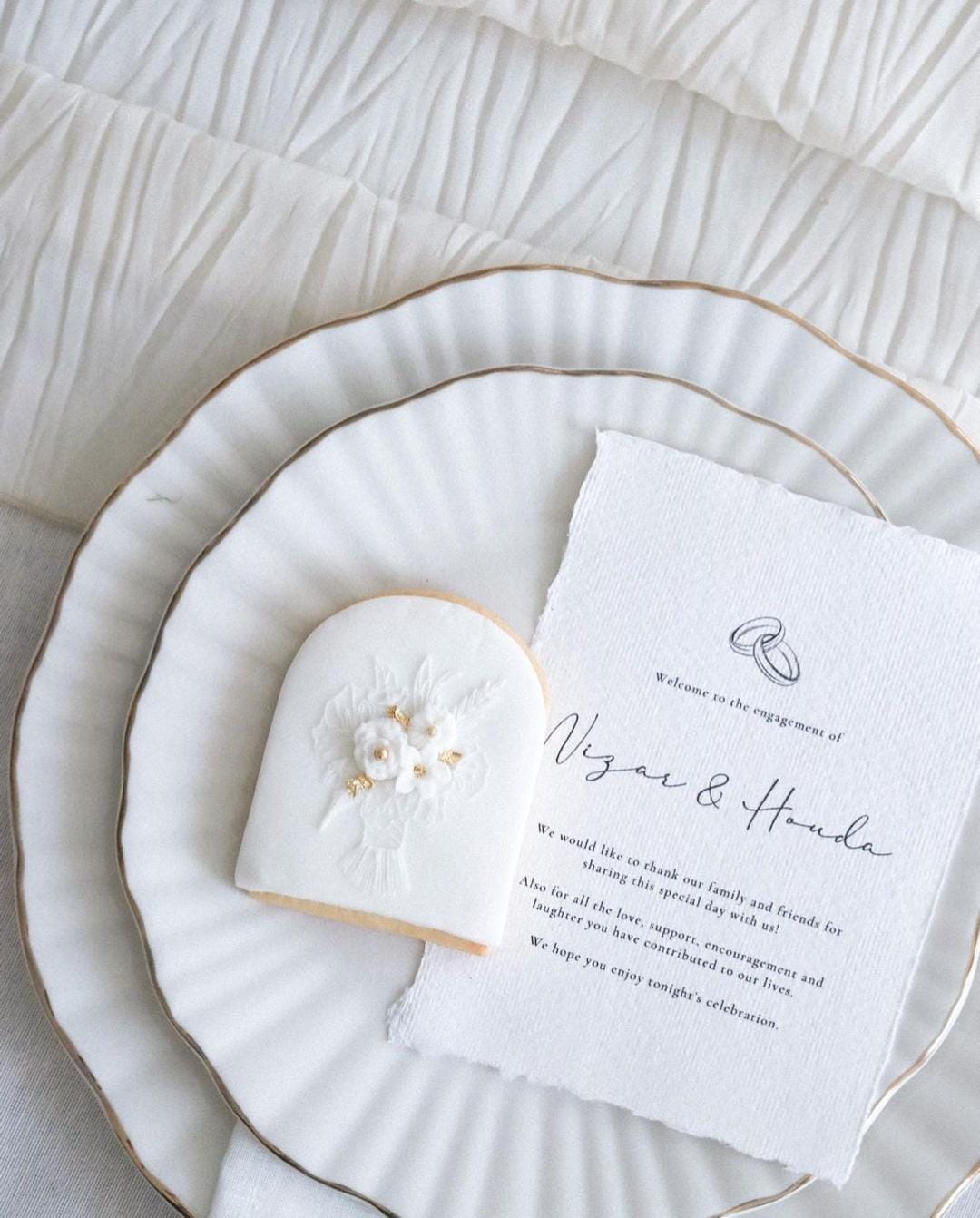 De tafelkaarten speciaal op maat ontworpen voor de verloving.